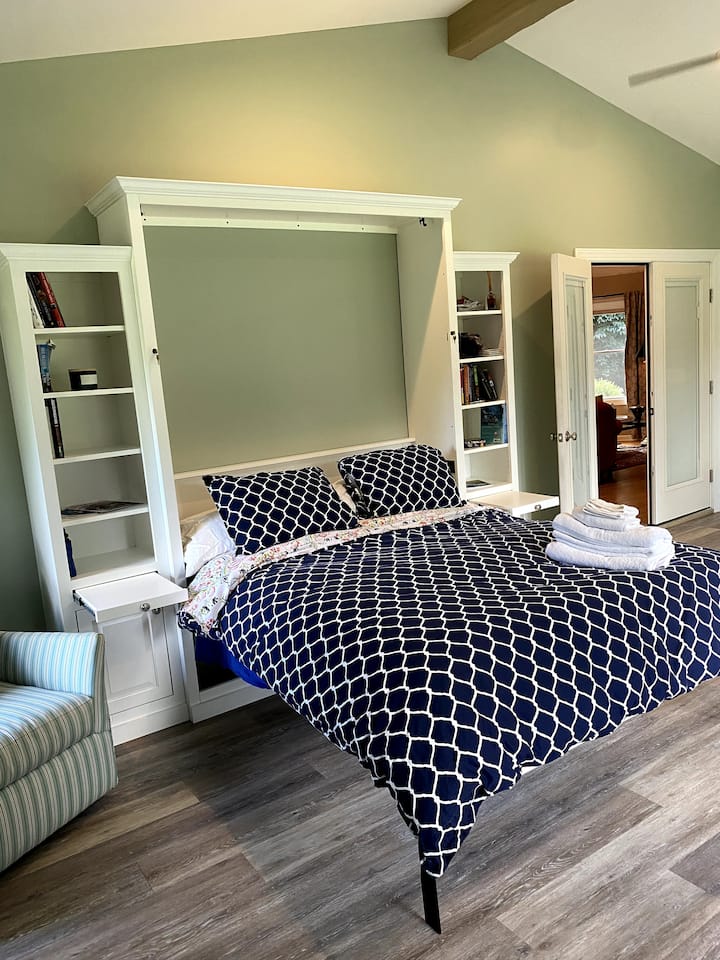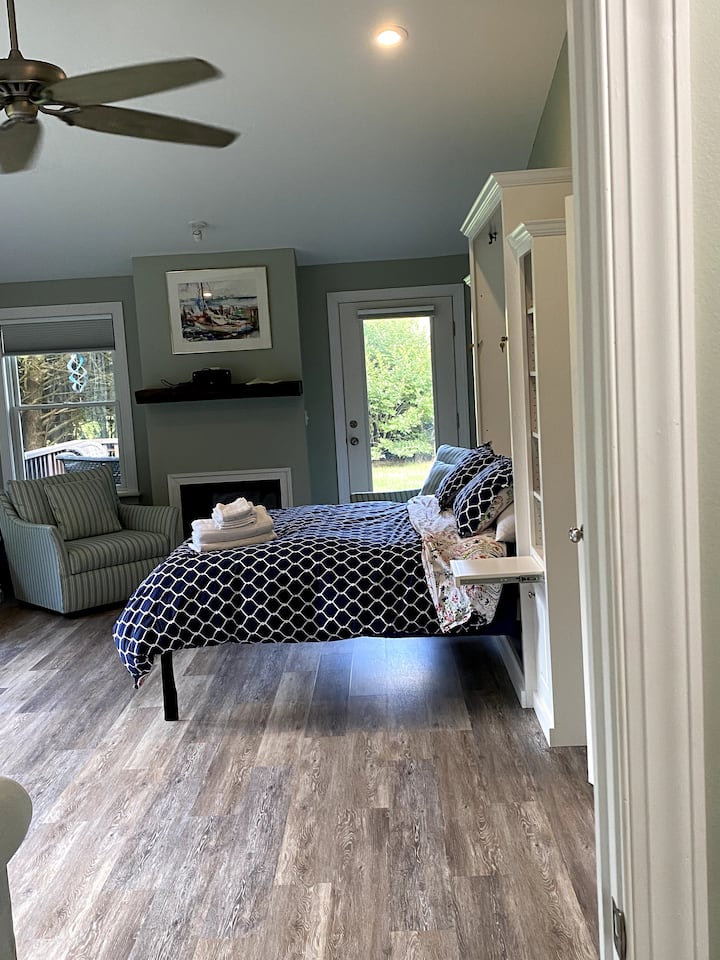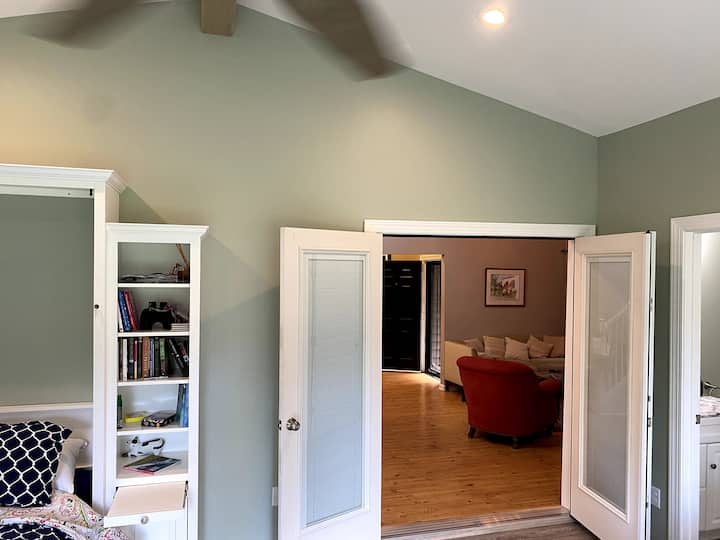 ชั้นบน: ห้องสวีทหลักพร้อมเตียงคิงไซส์ตู้เสื้อผ้าแบบวอล์คอินกว้างขวางและห้องน้ำเต็มรูปแบบพร้อมอ่างอาบน้ำ (เข้าถึงได้โดยบันไดเท่านั้น)