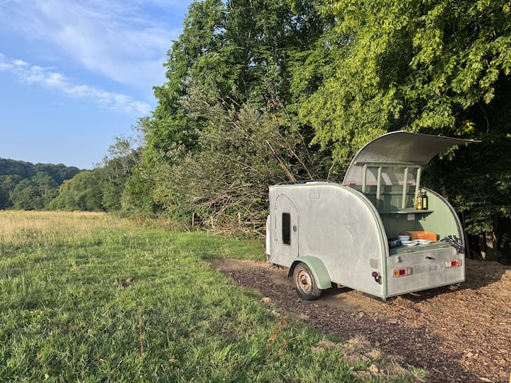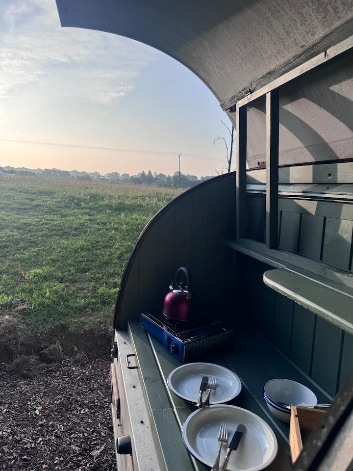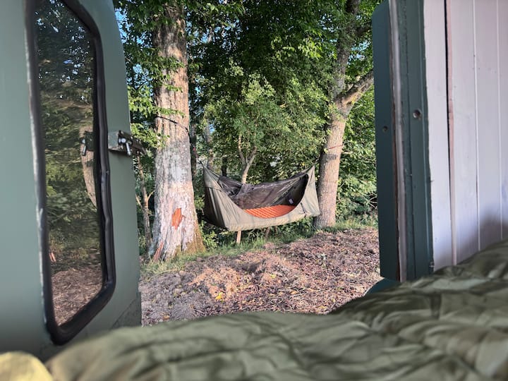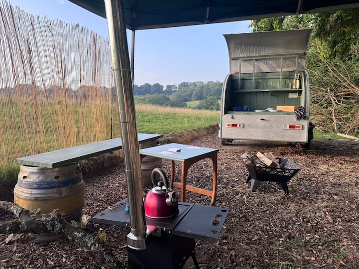 รถบ้านเล็กๆ ใกล้รถไฟไอน้ำ • หลุมก่อไฟใต้ต้นไม้