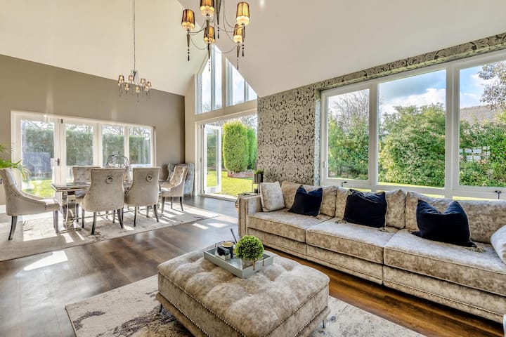ที่พักที่ได้รับการจัดอันดับให้เป็นอาคารเกรด II มี 3 ชั้นและสร้างความประทับใจให้คุณได้สัมผัสตั้งแต่วินาทีที่ก้าวเข้ามาในบ้าน การตกแต่งที่ไร้ที่ติผสมผสานเฟอร์นิเจอร์คุณภาพสูงเข้ากับสีสันลวดลายและพื้นผิวที่ซับซ้อนเพื่อสร้างการตกแต่งภายในที่สะดวกสบายและมีสไตล์อย่างไม่น่าเชื่อ เมื่อเข้ามาในประตู ห้องโถงทางเข้าขนาดใหญ่จะทำให้คุณรู้สึกว้าว มีคานเปิดโล่ง เตาเผาไม้ในเตาผิงอิฐ และโซฟาขนาดใหญ่ 2 ตัว ซึ่งนำไปสู่ห้องรับประทานอาหารที่หรูหรา มองเห็นวิวสวนและเนินเขาไกลๆ ผ่านหน้าต่าง ด้านหลังห้องภาพยนตร์มีจอฉายภาพขนาดใหญ่ ระบบเสียงที่ยอดเยี่ยม และโซฟาที่อบอุ่น ฝั่งตรงข้ามของโถงทางเดินเป็นพื้นที่นั่งเล่นแบบเปิดโล่งขนาดใหญ่ ซึ่งรวมถึงห้องครัวที่สร้างขึ้นตามสั่งที่ยอดเยี่ยม ซึ่งเชื่อมต่อกับห้องนั่งเล่นและห้องสวน ห้องครัวมีเตาอบไฟฟ้าและเตาไฟฟ้า เสริมด้วยห้องครัวรองที่ด้านหลังที่พักซึ่งมีเตาอบและเตาไฟฟ้าอีกเตา พร้อมสิ่งอำนวยความสะดวกในการซักรีด – มีประโยชน์สำหรับการจัดเก็บหรือเมื่อจัดเลี้ยงอาหารค่ำมื้อใหญ่ ขึ้นไป 2 ขั้นจากห้องครัวไปยังห้องนั่งเล่นหลัก ซึ่งเต็มไปด้วยที่นั่งหรูหราและมีเตาไม้และสมาร์ททีวีและระบบเสียงเพื่อความสะดวกสบายและการพักผ่อนขั้นสูงสุด ห้องสวนมีเพดานโค้ง หน้าต่างบานใหญ่ทั้ง 2 ด้าน และประตูระเบียง ทำให้แสงธรรมชาติเข้ามาได้เต็มที่ โต๊ะรับประทานอาหารขนาดเล็กสำหรับ 4 คนตั้งอยู่ที่นี่ ห้องอรรถประโยชน์ด้านหลังบ้านมีประตูไปสวน ทำให้ที่นี่เป็นสถานที่ที่ดีเยี่ยมในการวางเตียงสุนัขลง จากห้องโถงทางเข้า บันไดจะพาคุณไปยังชั้น 1 และห้องนอน 5 ใน 8 ห้อง รวมถึงห้องน้ำสำหรับครอบครัวที่กว้างขวางพร้อมอ่างอาบน้ำแบบอิสระและฝักบัวอาบน้ำแยกต่างหาก ห้องชุดหลักที่ยอดเยี่ยมมีห้องแต่งตัวและห้องอาบน้ำในตัวขนาดใหญ่ ห้องนอนขนาดคิงไซส์ซึ่งมีคานไม้โอ๊คทรงเอเฟรมที่น่าประทับใจ มีห้องน้ำในตัว และยังมีห้องนอนเดี่ยว ห้องนอนคู่ และห้องนอนแฝด ซึ่งห้องสองห้องหลังเชื่อมต่อกันหากคุณต้องการ ขึ้นไปชั้นสองเพื่อหาห้องนอนเตียงคู่อีก 3 ห้อง ห้องหนึ่งมีห้องอาบน้ำในตัว และทุกห้องสามารถมองเห็นวิวชนบทที่สวยงาม