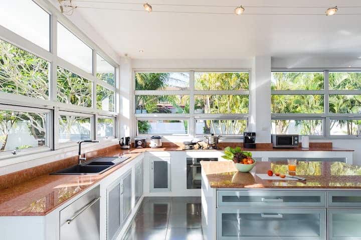 • ห้องครัวสำหรับนักชิมพร้อมอุปกรณ์ครบครันพร้อมเคาน์เตอร์หินอ่อนและเครื่องครัวครบชุด