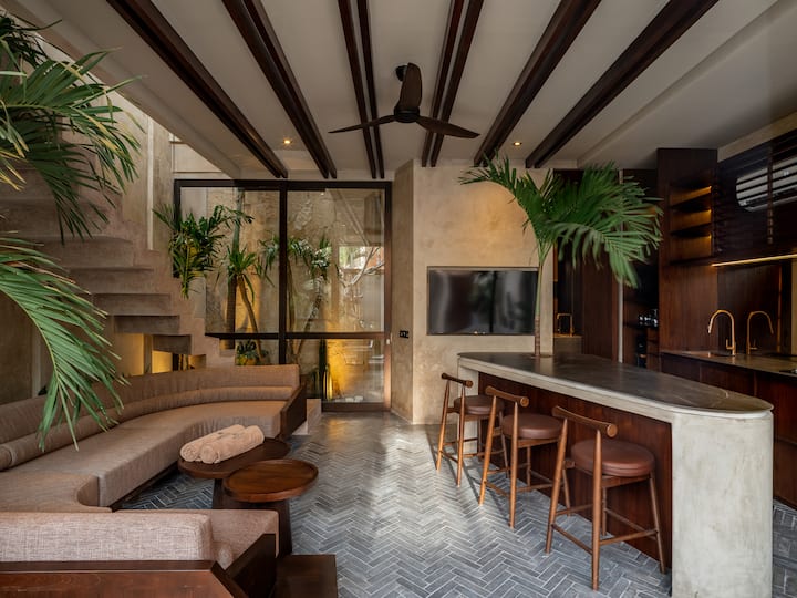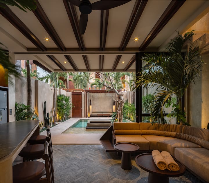 พื้นที่นั่งเล่นมีเลานจ์แบบจมสไตล์หรูที่มองเห็นสระว่ายน้ำส่วนตัวสีฟ้าอมเขียว พื้นที่น่าสนใจสำหรับการผ่อนคลายพร้อมหนังสือ ดื่มกาแฟยามเช้า หรือผ่อนคลายหลังพระอาทิตย์ตก ห้องครัวมีอุปกรณ์ครบครันพร้อมเครื่องใช้ไฟฟ้าทันสมัย อุปกรณ์ทำอาหาร และเคาน์เตอร์รับประทานอาหารสไตล์บาร์ เหมาะสำหรับการเตรียมอาหารหรือการดื่มเครื่องดื่มร่วมกัน ผังภายในและภายนอกไหลไปยังดาดฟ้าสระว่ายน้ำโดยตรง พร้อมเตียงอาบแดดและห้องนั่งเล่นโซฟาที่อบอุ่นสำหรับดื่มด่ำกับลมเขตร้อน