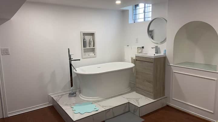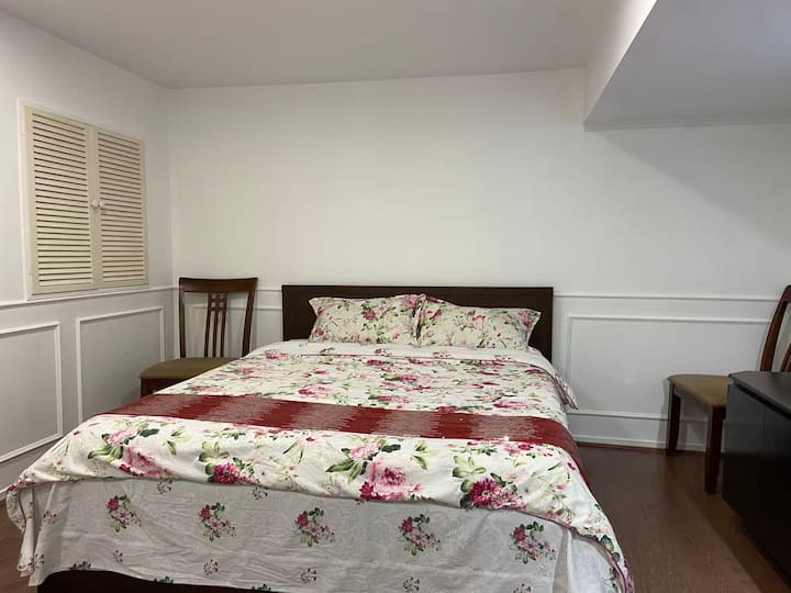 ผ่อนคลายในห้องนอนส่วนตัวของคุณที่มีเตียงควีนไซส์ ผ้าปูที่นอนใหม่ ตู้เสื้อผ้า และอ่างอาบน้ำกับอ่างล้างหน้าของคุณเอง โปรดทราบว่า: โถส้วมอยู่นอกห้องและเป็นของส่วนกลาง ผู้เข้าพักยังสามารถใช้ห้องครัวที่มีอุปกรณ์ครบครัน พื้นที่รับประทานอาหาร สวนหลังบ้านที่มีแสงแดด และห้องนั่งเล่นที่มีโต๊ะพูล เชื่อมต่อกับ Wi-Fi ที่รวดเร็ว สบายๆ ด้วยเครื่องปรับอากาศส่วนกลาง และเดินทางเบาๆ ด้วยเครื่องซักผ้าและเครื่องอบผ้าฟรี ตั้งอยู่ในย่านที่เงียบสงบใกล้กับร้านค้า ร้านอาหาร และการขนส่ง