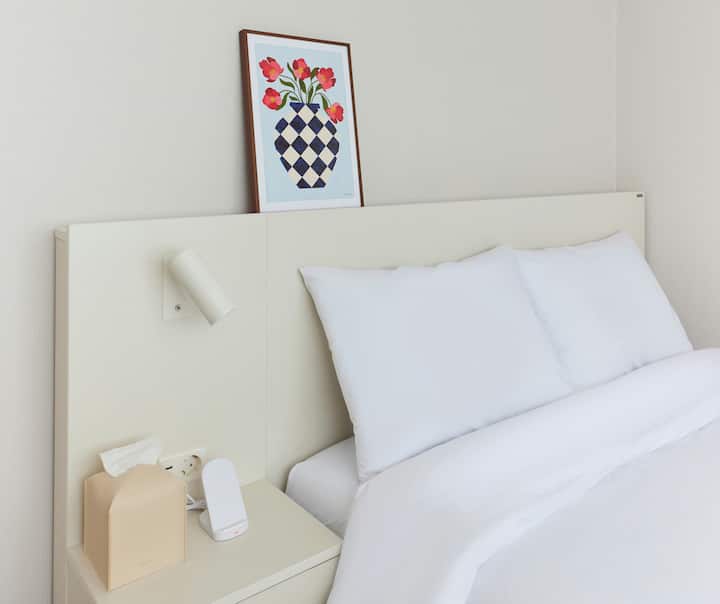 เตียงเดี่ยวพิเศษ, ที่นอนเมมโมรี่โฟมหรู, เครื่องนอนในโรงแรม, โต๊ะข้างเตียง, ไฟส่องสว่าง, ม่านทึบแสง, ที่แขวนเสื้อผ้า