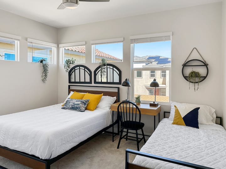 ห้องนอนควีนไซส์ + เตียงคู่มีเตียงควีนไซส์ 1 เตียงเตียงคู่โต๊ะทำงานพร้อมเก้าอี้พัดลมเพดานและตู้เสื้อผ้าแบบเอื้อมถึง (นอนได้ 4 คน)