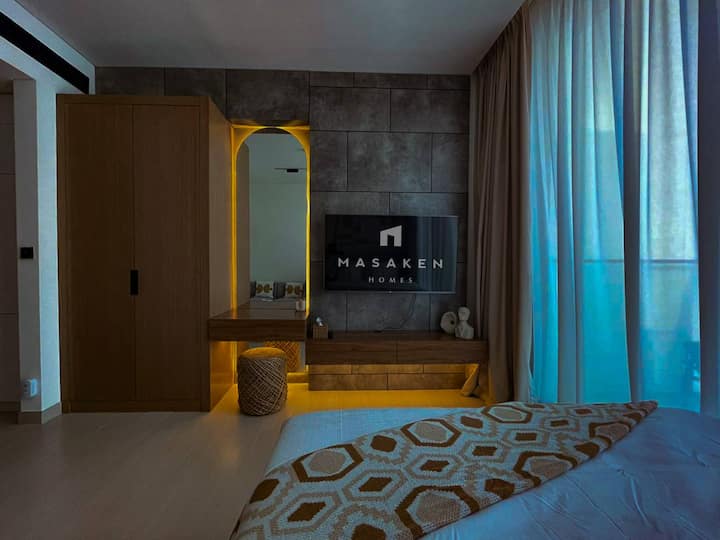 สตูดิโอนี้ตั้งอยู่บนชั้น 20 ของ Binghatti Azure มีที่พักผ่อนที่ประณีตด้วยโทนสีธรรมชาติที่ผ่อนคลาย การตกแต่งด้วยสีทอง และเฟอร์นิเจอร์ทันสมัยที่คัดสรรมาเป็นอย่างดี พื้นที่เปิดโล่งมีเตียงขนาดควีนไซส์หรูหรา เลานจ์โซฟานุ่มสบาย และสมาร์ททีวี ขณะที่หน้าต่างสูงจากพื้นจรดเพดานช่วยให้แสงธรรมชาติเข้ามาได้ดีและยังมีระเบียงส่วนตัวที่มองเห็นวิวเมืองแบบพาโนรามา ห้องครัวที่เรียบหรูพร้อมเครื่องใช้ไฟฟ้าระดับไฮเอนด์และห้องน้ำร่วมสมัยที่ตกแต่งด้วยสีทองช่วยเติมเต็มประสบการณ์การใช้ชีวิตระดับไฮเอนด์