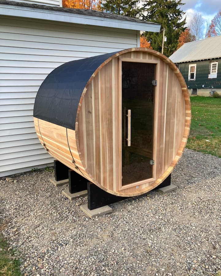 ➤ซาวน่าทรงถังและบริเวณกองไฟที่อบอุ่นพร้อมวิวเนินเขา
