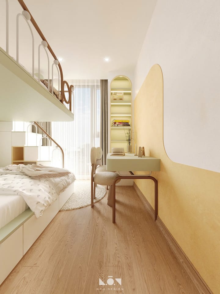 ห้องนอนเด็ก: ชุดเตียงสองชั้นและโต๊ะทำงานสร้างที่พักที่สะดวกสบายที่ลูกๆของคุณสามารถเล่นได้ในขณะที่ยังมีความเป็นส่วนตัว