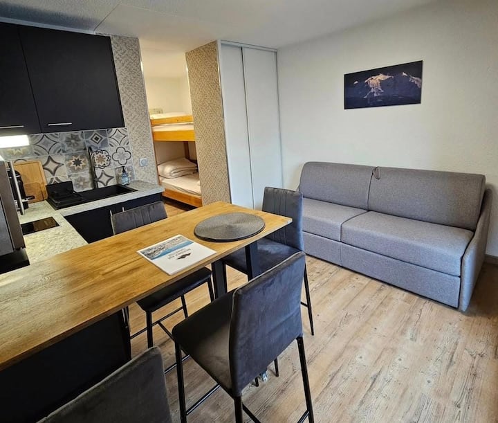 ห้องพักที่มีเตียง 4 เตียงอยู่ใกล้กับลานสกีและมีสิ่งอำนวยความสะดวกครบครัน