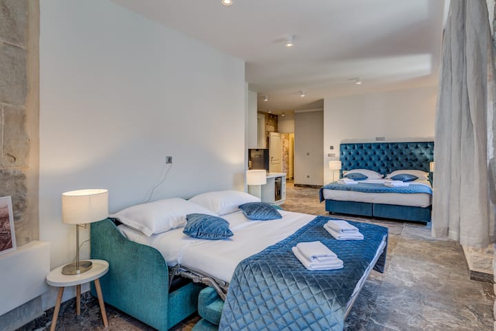 ห้องพัก 4 ห้องมีขนาด 20-25 ตร.ม. ในขณะที่ห้องสวีทขนาดใหญ่ 70 ตร.ม. มีห้องครัวชั้นเยี่ยมที่มีอุปกรณ์ครบครันและห้องนั่งเล่นขนาดใหญ่ ที่พักทั้งหมดตั้งอยู่บนชั้น 3 ของอาคาร ส่วนที่พัก 3 ห้องมีวิวทะเลและต้นปาล์มของทางเดินหลัก ห้องพักทุกห้องมีเตียงขนาด 180x200 ชุดเครื่องนอนระดับพรีเมียม และหมอนป้องกันอาการแพ้ ห้องพักมีทีวีจอแบน ตู้เย็นขนาดเล็ก ส่วนห้องน้ำมีพื้นอุ่นและไดร์เป่าผม ห้องพักมีเซรามิกและงานไม้ที่พิเศษที่สุดและห้องน้ำแต่ละห้องมีเครื่องทำความร้อนใต้พื้นและเครื่องปรับอากาศแต่ละห้อง