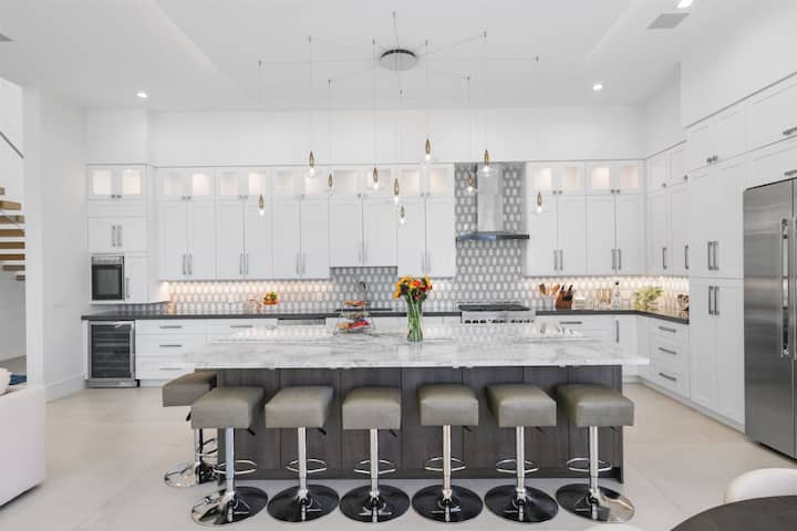 • ห้องครัวเชฟที่มีอุปกรณ์ครบครันพร้อมเครื่องจ่ายไวน์และเครื่องทำน้ำแข็ง
