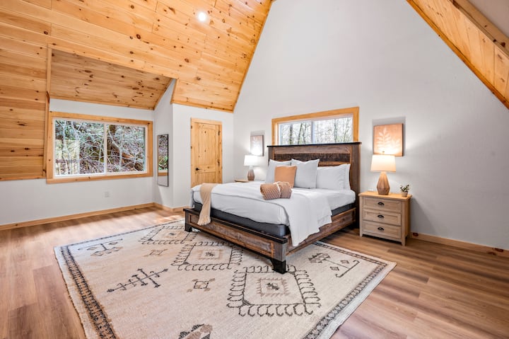 ห้องนอนขนาดคิงไซส์ 2: ตั้งอยู่ที่ชั้นแรก เตียงคิงไซส์ สมาร์ททีวีโรคุ เตาผิงไฟฟ้า หมอนและผ้าห่มเสริม ห้องน้ำเต็มรูปแบบส่วนตัวพร้อมฝักบัวแบบวอล์คอิน ทางเข้าส่วนตัวไปยังดาดฟ้า มีผ้าปูที่นอนทั้งหมดให้