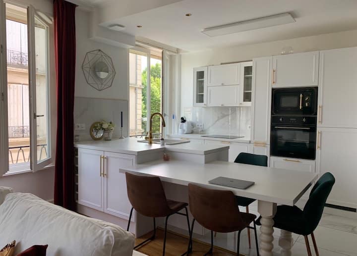 ห้องครัวสีขาวและสีทองของที่พักมีอุปกรณ์ครบครัน และเชื่อมต่อกับพื้นที่นั่งเล่นที่สว่างไสวด้วยหน้าต่างบานใหญ่ที่มองเห็นวิวแม่น้ำโรน