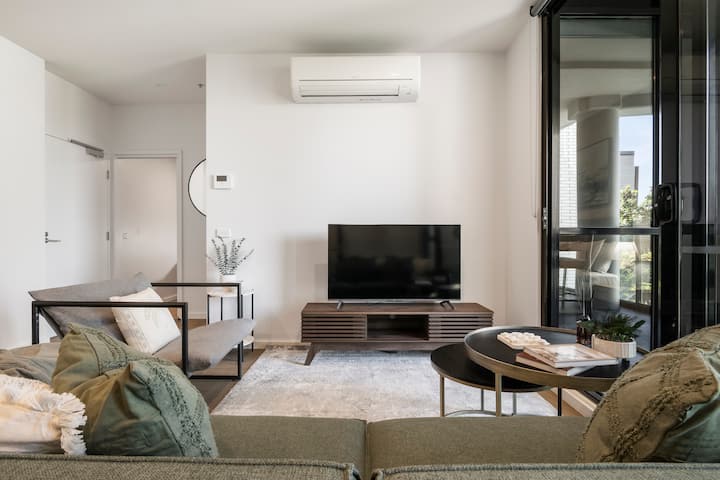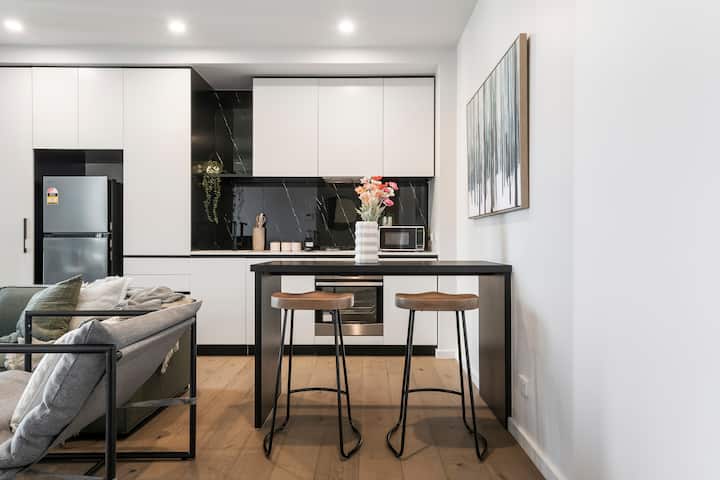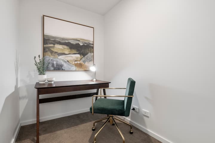 อพาร์ทเมนท์ 1 ห้องนอนสไตล์โมเดิร์นในริชมอนด์ที่มีชีวิตชีวาพร้อมโต๊ะทำงาน!