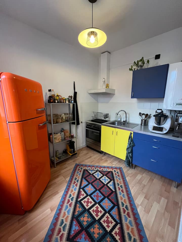 ครัวที่มีสีสันและใช้งานได้ดีพร้อมตู้เย็น SMEG เตาอบ เตา Thermomix เครื่องชงกาแฟ (เมล็ดหรือกรอง) และเครื่องใช้ในครัว คุณจะพบทุกสิ่งที่คุณต้องการในการทำอาหารเหมือนอยู่ที่บ้านในบรรยากาศที่ร่าเริงและเก่าแก่