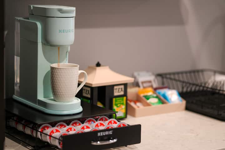 สถานีกาแฟเฉพาะของเรามีกาแฟปกติ กาแฟไร้คาเฟอีน และชาหลากหลายชนิด เพื่อให้คุณเพลิดเพลินกับเครื่องดื่มที่คุณชื่นชอบขณะอ่านหนังสือหรือหัวเราะกับครอบครัวของคุณในเกมกระดาน ครอบครัวของเรามุ่งมั่นที่จะทำให้มั่นใจว่ามีสิ่งที่ดึงดูดสมาชิกในครอบครัวของคุณทุกคนให้รู้สึกเหมือนอยู่บ้าน