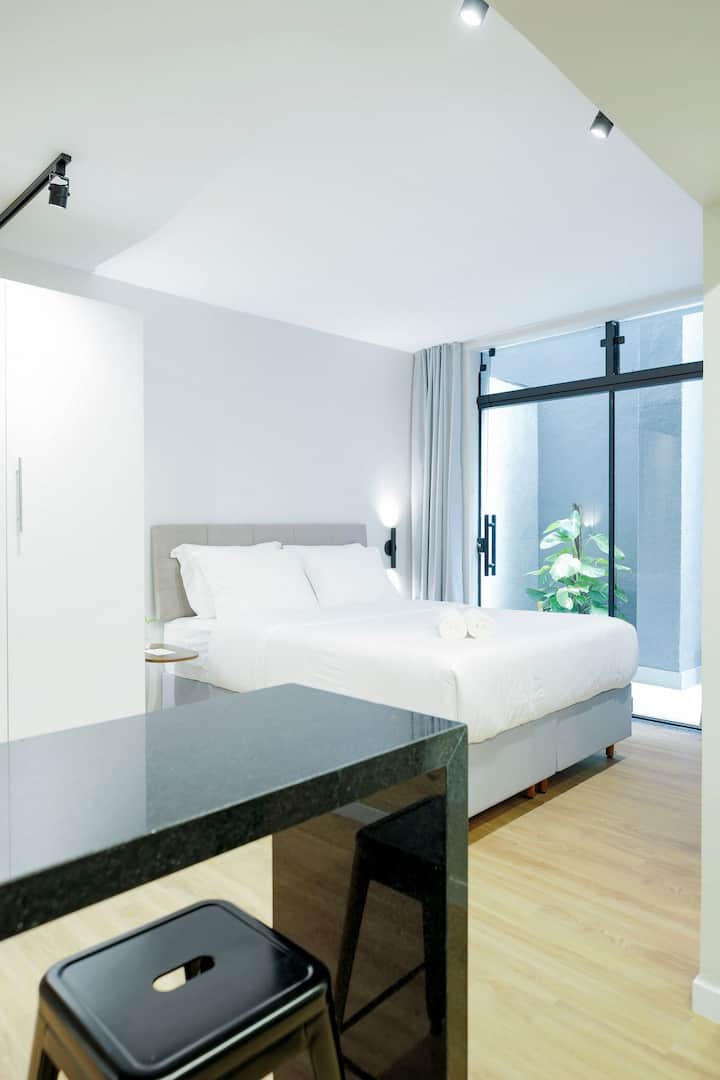สตูดิโอสไตล์โมเดิร์นพร้อมเครื่องปรับอากาศและทำเลที่ตั้งดีเยี่ยม