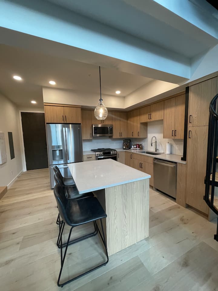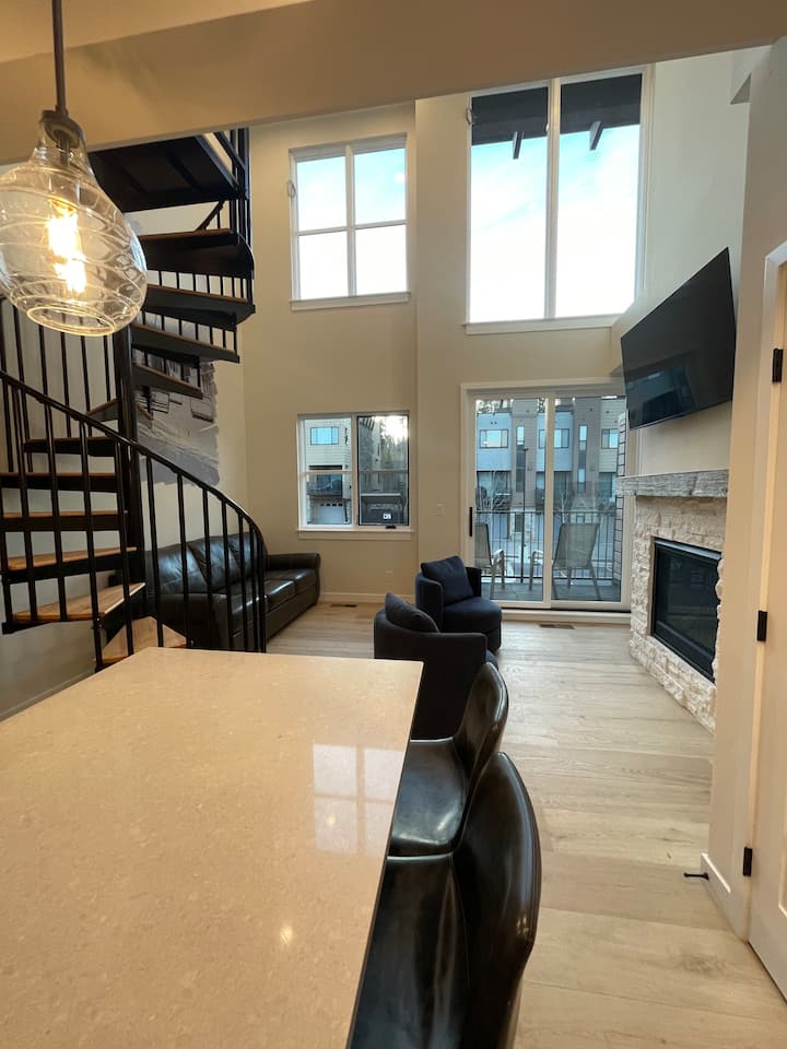 คอนโดที่ออกแบบมาอย่างพิถีพิถันหลังนี้ผสมผสานสไตล์ภูเขาสมัยใหม่เข้ากับความสะดวกสบายและความสะดวก พื้นที่นั่งเล่นแบบเปิดโล่งมีเตาผิงก๊าซที่อบอุ่น ที่นั่งสบายๆ และหน้าต่างบานใหญ่ที่ทำให้รู้สึกเหมือนอยู่กลางแจ้ง ห้องครัวที่มีอุปกรณ์ครบครันประกอบด้วยเครื่องใช้ไฟฟ้าเหล็กกล้าไร้สนิม เคาน์เตอร์ควอตซ์ และทุกอย่างที่คุณต้องการสำหรับทำอาหารที่บ้านหรือเตรียมของว่างหลังเล่นสกี