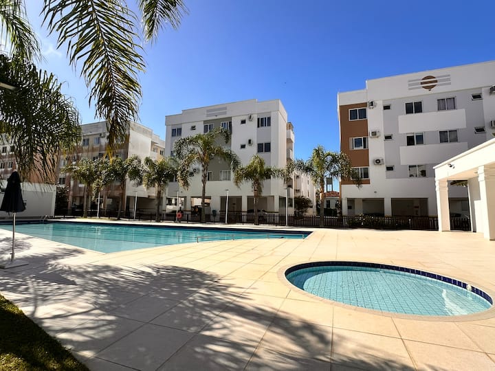 Área das piscinas, quadras poliesportivas, sala de jogos, playgrands, área pet, área verde, redário, e minimarket.