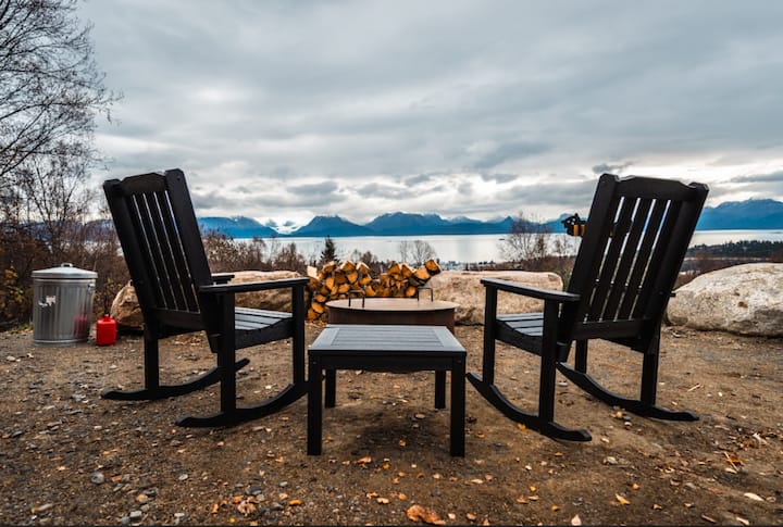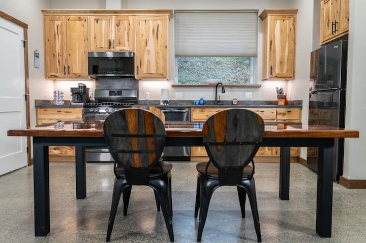 ก้าวออกไปข้างนอกเพื่อไปยังอ่างน้ำร้อนส่วนตัวที่มีที่ครอบและแช่ตัวขณะชมภูเขา สัตว์ป่า และแสงอาทิตย์ยามเย็น พื้นคอนกรีตขัดเงา แสงสว่างอบอุ่น และการตกแต่งที่เป็นมิตรกับสัตว์เลี้ยง ที่พักแห่งนี้ผสมผสานความสะดวกสบายทันสมัยเข้ากับเสน่ห์อันเงียบสงบของอะแลสกา