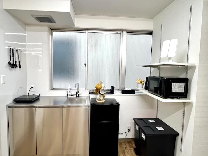 ◆ ห้องครัวมีอ่างล้างจาน พื้นที่ทำอาหาร เตาแม่เหล็กไฟฟ้า 1 เตา ไมโครเวฟ ตู้เย็น และหม้อไฟฟ้า คุณจึงเพลิดเพลินกับการทำอาหารด้วยตัวเองได้(มีกระทะ หม้อ มีด เขียง จาน ถ้วย แก้วน้ำ ตะเกียบ ช้อน และส้อมให้ด้วย)