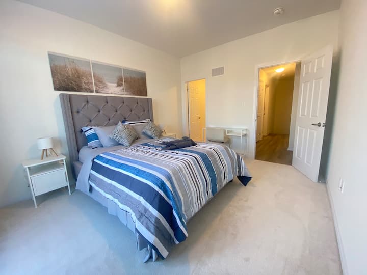 เตียงใหญ่พร้อมห้องน้ำส่วนตัวและระเบียง