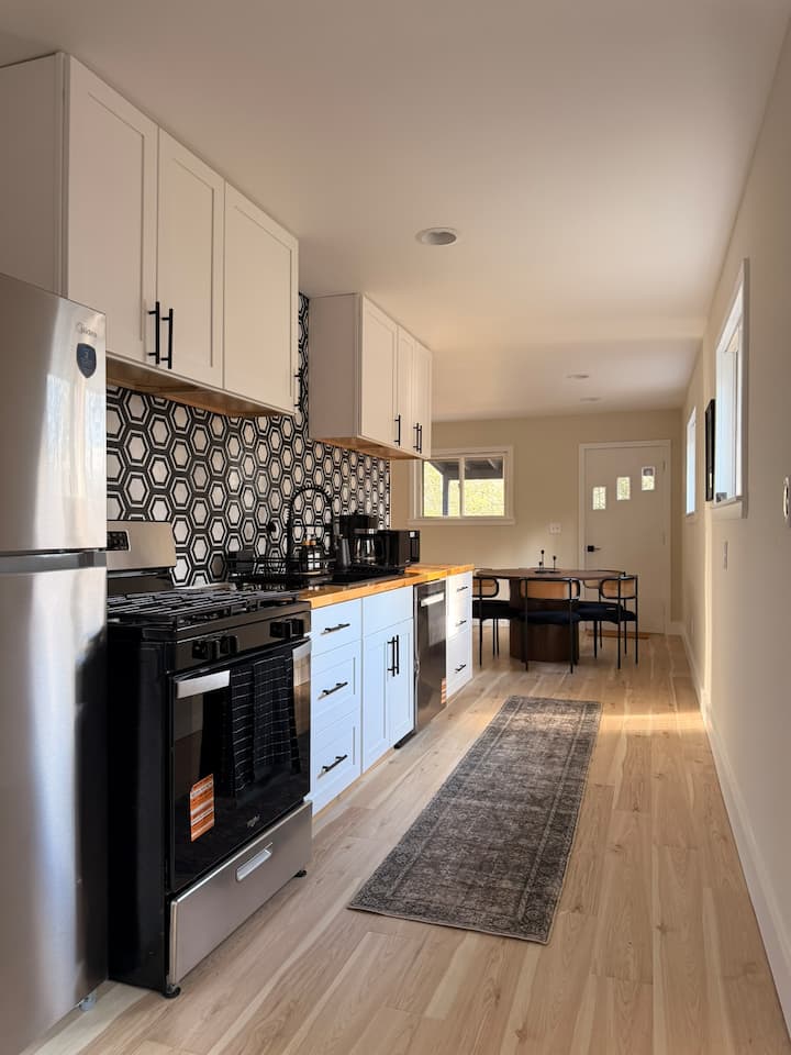 ห้องครัวที่มีอุปกรณ์ครบครันรวมถึงเครื่องใช้ไฟฟ้าขนาดใหญ่ เครื่องครัว และสิ่งของจำเป็นในชีวิตประจำวันสำหรับการทำอาหารร่วมกัน สำหรับผู้ที่ชื่นชอบกาแฟ เรามีเครื่องบดกาแฟ Fellow Opus กาต้มน้ำคอห่าน V60 และเครื่องชั่งกาแฟ ไม่จำเป็นต้องนำอุปกรณ์จากบ้านมา