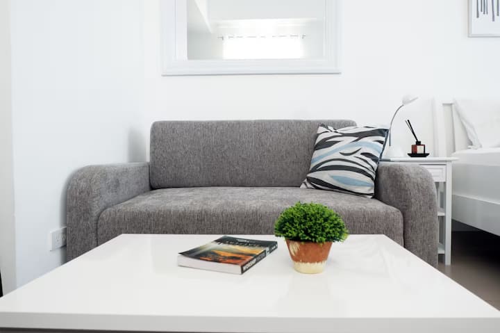 • เตียงควีนไซส์ (60” x 75”) ที่นอนพรีเมียม ผ้าปูที่นอนและผ้าห่มใหม่ หมอน เครื่องปรับอากาศแบบแยกส่วน โต๊ะข้างเตียงพร้อมโคมไฟตั้งโต๊ะ ทีวีอัลเอชดีขนาด 43" สมาร์ททีวีพร้อมใช้งาน USB ที่ติดตั้งทีวีแบบเคลื่อนไหวได้เต็มรูปแบบ PS4