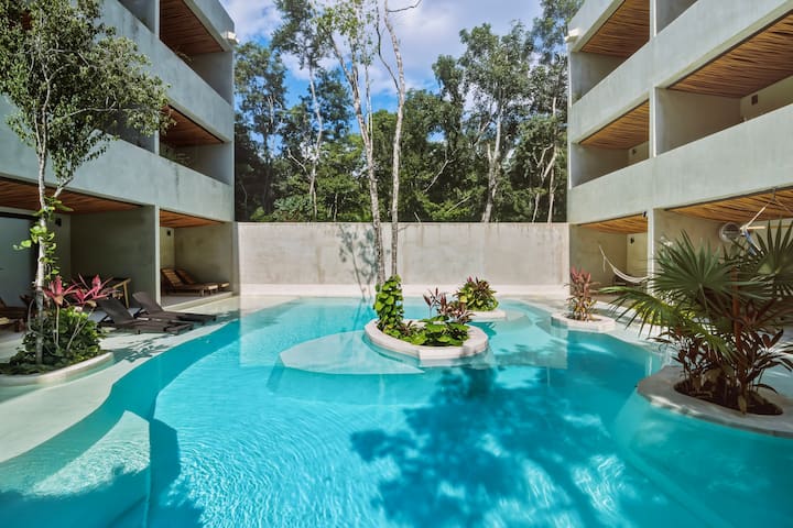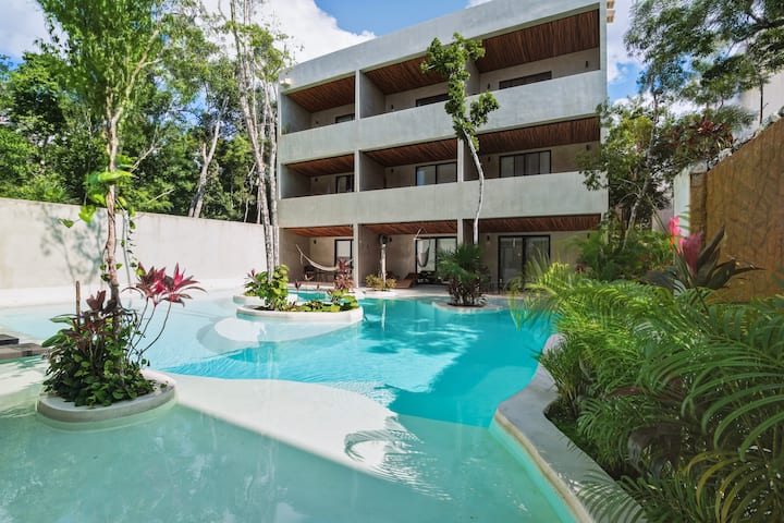 "พรุ่งนี้ดีมีจิตวิญญาณฟรี! ฉันชื่อไมเคิลชาวประมงผู้ที่ชื่นชอบการเล่นสกีพ่อครัวใหญ่และผู้แสวงหาความตื่นเต้นบนบกและน้ำ! มาหลบหนีไปยังสวรรค์ในอพาร์ทเมนท์หรู 1 ห้องนอนที่มีสระว่ายน้ำในอาเรีย ตูลุม ที่ซึ่งความสง่างามทันสมัยมาบรรจบกับความเงียบสงบของเขตร้อน ก้าวตรงจากระเบียงส่วนตัวของคุณเข้าสู่สระว่ายน้ำระยิบระยับที่ล้อมรอบด้วยพืชพันธุ์เขียวชอุ่มและเก้าอี้เลานจ์ไม้ เหมาะสำหรับช่วงบ่ายที่เกียจคร้านภายใต้แสงแดด ภายในห้องพัก ผ่อนคลายบนเตียงคิงไซส์ขนาดใหญ่