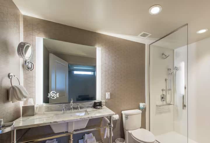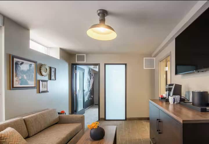 ด้านหนึ่งมีห้องนอนส่วนตัวพร้อมเตียงคิงไซส์ที่มีผ้าปูที่นอน ผ้านวม และหมอนอิงแบบพิเศษ ห้องน้ำขนาดใหญ่และพื้นที่นั่งเล่นที่อบอุ่นมีเตาผิงไฟฟ้า โซฟาเตียง ทีวีขนาด 55 นิ้ว และบาร์พร้อมครัวเล็กและโต๊ะรับประทานอาหารสำหรับ 6 คน