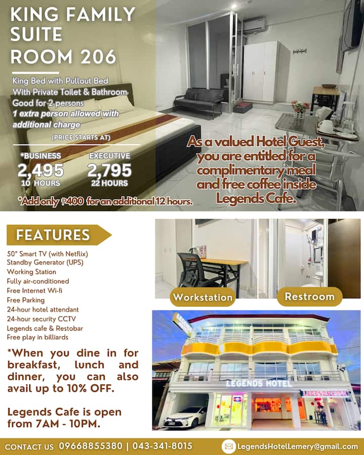 Legends Hotel & Event Hall มีห้องพักหรูหราและ Legends Cafe ที่น่าตื่นตาตื่นใจใจกลาง Lemery