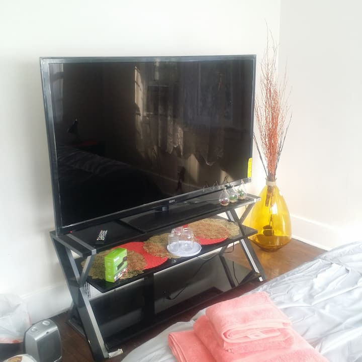 ห้องฮอลลีวูดส่วนตัวราคาประหยัดพร้อมทีวีขนาด 55 นิ้ว Wi-Fi และเน็ตฟลิกซ์