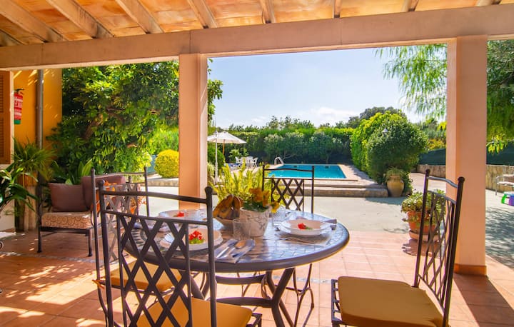 วิลล่า Can Aloy เหมาะสำหรับครอบครัวและมีราคาไม่แพงมาก ตั้งอยู่ในพื้นที่ชนบทที่เงียบสงบ หากครอบครัวของคุณมีสัตว์เลี้ยง สัตว์เลี้ยงเหล่านั้นก็สามารถมาพักผ่อนที่วิลล่ากับคุณได้เช่นกัน ที่พักรายล้อมไปด้วยต้นมะกอกที่มีลักษณะโค้งงอและพืชพันธุ์แบบเมดิเตอร์เรเนียนทั่วไป คุณจะพบกับทุกสิ่งที่ต้องการบนระเบียงของที่พัก: สระว่ายน้ำแบบเรียบพื้นพร้อมกระเบื้องโมเสกและลวดลายแบบคดเคี้ยวชวนให้คุณลงไปแช่ตัวให้สดชื่น ทางเข้าอยู่ด้านล่างของสระว่ายน้ำ โดยใช้บันไดหรือขั้นบันไดกว้าง 4 เมตร สระว่ายน้ำตั้งอยู่บนระเบียงอาบแดดหินธรรมชาติ นอกจากเก้าอี้อาบแดด 4 ตัวแล้ว ยังมีพื้นที่นั่งเล่นที่เรียบง่ายพร้อมเก้าอี้หลายตัว เพื่อให้คุณไม่ร้อนเกินไปในฤดูร้อน เรามีร่มกันแดด 2 ใบให้บริการตามคำขอ สามารถเดินไปยังระเบียงของบ้านได้โดยผ่านพื้นที่ปูพื้น ทางด้านซ้ายมือ คุณจะพบเตาปิ้งย่างอิฐ ซึ่งเหมาะสำหรับการปิ้งย่างแบบสบายๆ หากคุณชอบทำอาหารเองในช่วงวันหยุด ที่ด้านหลังของที่พัก เจ้าของบ้านที่เป็นมิตรมีสวนผักและสวนผลไม้ พวกเขายินดีแบ่งปันผลผลิตจากสวนที่สดใหม่ของพวกเขา และมอบผลผลิตที่สดใหม่และสุกด้วยแสงแดดให้คุณ อีกครึ่งหนึ่งของบ้านจริงๆ แล้วเป็นของเจ้าของที่พักด้วย และเจ้าของที่พักจะใช้ส่วนตัวเมื่อไม่มีผู้เข้าพักในวิลล่า เพื่อให้พวกเขาได้เพลิดเพลินกับความเป็นส่วนตัวที่นี่ ที่พักที่เราชื่นชอบที่สุดในวิลล่านี้คือระเบียงที่มีหลังคาคลุมอย่างไม่ต้องสงสัย ซึ่งเรายังสามารถเข้าถึงบ้านได้จากที่นั่นด้วย ตกแต่งอย่างสวยงามด้วยโต๊ะรับประทานอาหารและชุดโซฟาสไตล์โมร็อกโกที่สะดวกสบายพร้อมโครงโลหะแบบฟิลิกรี คุณสามารถเพลิดเพลินไปกับมื้ออาหารหรือการพักดื่มกาแฟที่นี่ได้ทุกเวลาในระหว่างการพักผ่อน คุณสามารถอ่านหนังสือบนเก้าอี้โยกที่สบายและเพลิดเพลินไปกับบรรยากาศที่มีการตกแต่งแบบมายอร์กาโดยทั่วไป เช่น โคมไฟที่สวยงามและน้ำพุที่ไม่ได้ใช้งานอีกต่อไป