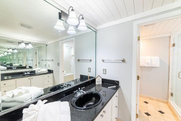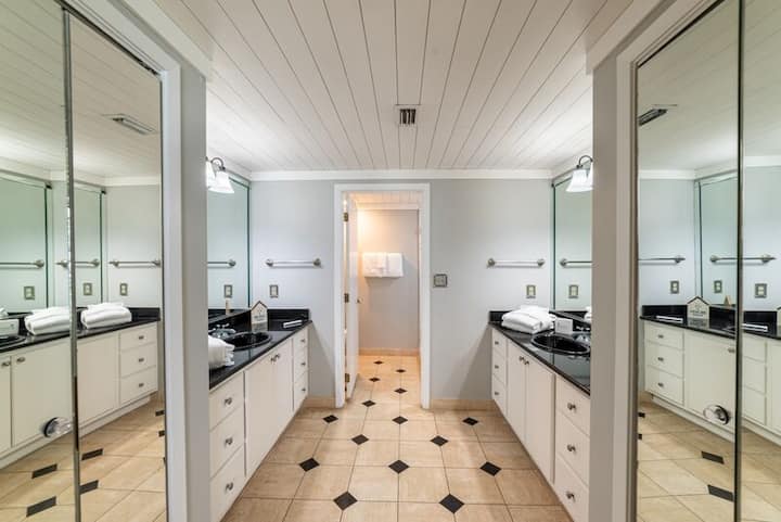 ห้องมาสเตอร์สวีทที่แท้จริง 2 ห้องตั้งอยู่บนชั้นหลัก ทั้งสองห้องมีวิวทะเลที่สวยงาม แต่ละห้องมีเตียงคิงไซส์ ฝักบัวอาบน้ำแบบวอล์คอิน อ่างล้างหน้าคู่ และประตูกระจกบานเลื่อนที่เปิดออกไปยังระเบียงรอบบ้านได้โดยตรง ตื่นขึ้นมาก็มองเห็นอ่าวจากห้องนอนใหญ่ทั้งสองห้องเป็นไฮไลท์ของบ้าน ตรงข้ามห้องโถง ห้องเตียงสองชั้นเหมาะสำหรับเด็กหรือวัยรุ่น มีเตียงสองชั้นเต็มรูปแบบ 2 เตียงและห้องน้ำใกล้เคียงพร้อมอ่างอาบน้ำและฝักบัว