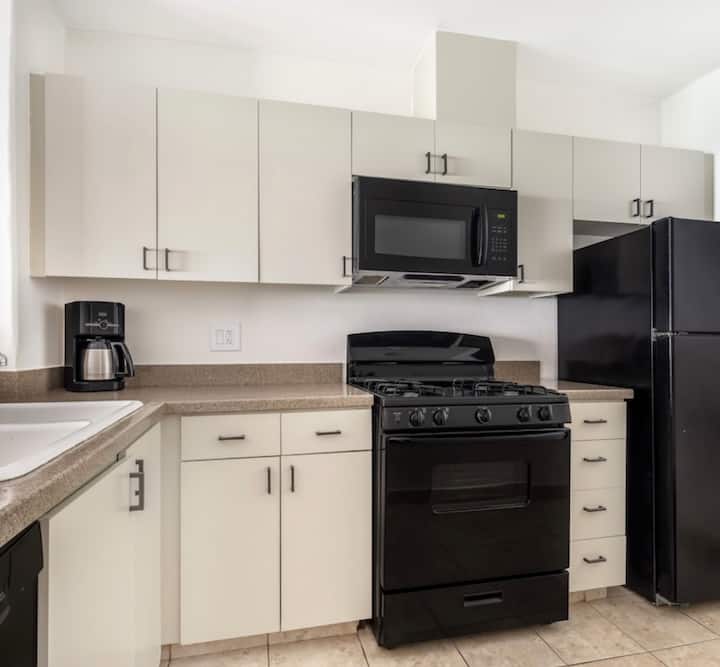 ห้องครัวเต็มรูปแบบประกอบด้วยตู้เย็น เตา/เตาอบ และเครื่องล้างจาน
