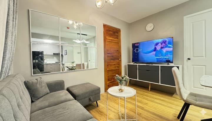 ก้าวเข้าสู่ห้องพัก 2 ห้องนอนที่ตกแต่งใหม่ หรูหรา และเก๋ไก๋ที่ไพน์สวีทส์ เมืองตากายไตย์ สตรีมรายการโปรดของคุณบนสมาร์ท HDTV ขนาด 55 นิ้ว หรือเชื่อมต่อกับ Wi-Fi ความเร็วสูง