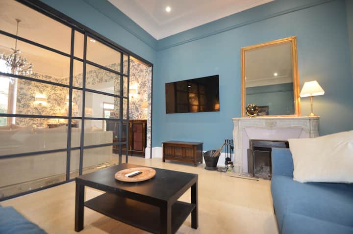 เพดานสูง บัวตกแต่ง ที่ตั้งเตาผิงแบบโบราณ และวอลล์เปเปอร์ที่หรูหรา ผสมผสานกันอย่างกลมกลืนกับสิ่งอำนวยความสะดวกที่ทันสมัยและความสะดวกสบายระดับไฮเอนด์
