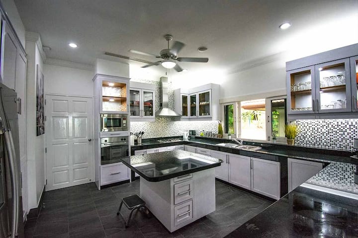 จากบริเวณแผนกต้อนรับคุณจะเข้าสู่ห้องนั่งเล่นขนาดใหญ่พร้อมทีวีขนาด 50 "และระบบเสียง Bose เดินผ่านไปยังพื้นที่รับประทานอาหารอย่างเป็นทางการพร้อมโต๊ะและเก้าอี้ที่นั่ง 12 ที่คุณสามารถรับประทานอาหารอย่างมีสไตล์พร้อมวิวเหนือสระว่ายน้ำ หน้าต่างคอนเสิร์ตเปิดไปยังห้องครัวสไตล์ยุโรปขนาดใหญ่ที่มีอุปกรณ์ครบครันซึ่งมีเกาะ/บาร์อาหารเช้าพร้อมที่นั่งสำหรับ 2 คนได้อย่างสะดวกสบาย