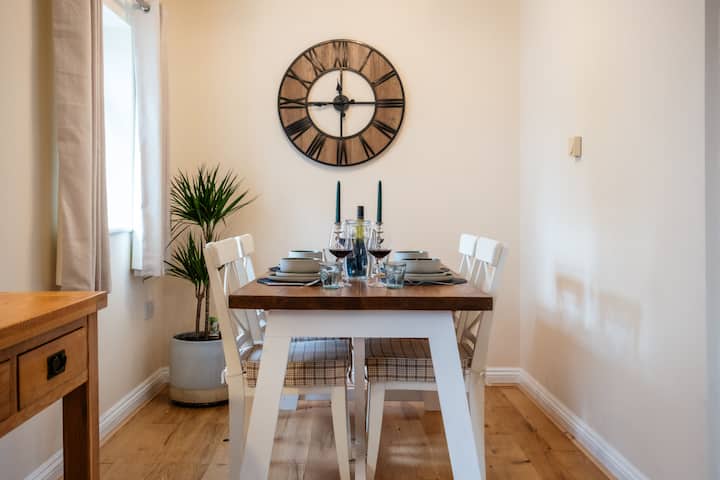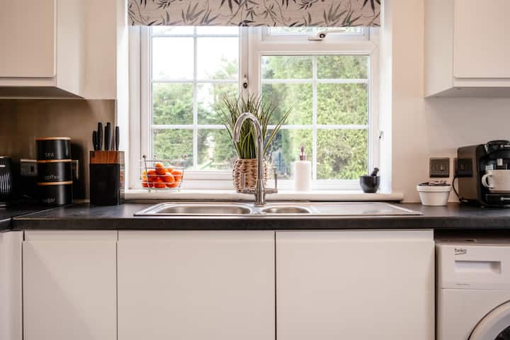 ห้องครัวทันสมัยมีเตาอบไฟฟ้าสองชั้นและเตาไฟฟ้า ไมโครเวฟ ตู้เย็นตู้แช่แข็ง เครื่องซักผ้า และเครื่องชงกาแฟ (เครื่องชงกาแฟ Tassimo มีแคปซูลกาแฟไว้ให้บริการเล็กน้อยสำหรับการมาถึงของคุณ) มีประตูไปยังสวนด้านหลัง