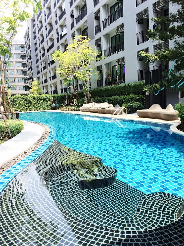Wi-Fi ฟรี สระว่ายน้ำและห้องออกกำลังกาย คอนโด สถานีรถไฟฟ้าบีทีเอสสำโรง