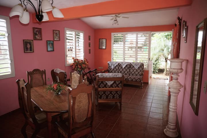 ยินดีต้อนรับไม่ใช่แค่บ้านของคุณใน Viñales แต่เป็นประสบการณ์ที่แท้จริง บ้านพักตั้งอยู่ใจกลางเมืองบนถนนด้านข้างที่เงียบสงบเดินเพียงไม่กี่นาทีจากใจกลางเมือง ครอบครัวของเราอาศัยอยู่ด้านหลังของบ้านให้ความเป็นส่วนตัวแก่คุณแม้ว่าคุณจะสามารถเข้าร่วมกับเราเพื่อดื่มกาแฟหรือพูดคุยในระเบียงได้ตลอดเวลาที่คุณต้องการเรารักการมีปฏิสัมพันธ์กับผู้เข้าพักของเราด้วยความเคารพดังนั้นเราจึงเรียนรู้เกี่ยวกับวัฒนธรรมของกันและกัน! มี Wi-Fi ฟรี 1 ชั่วโมง เราจองแท็กซี่ Colectivo จากฮาวานา