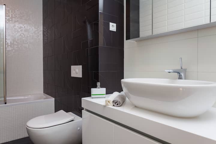 อพาร์ทเมนท์มีทีวีจอแบนที่มีรายการนั่งมากกว่า 400 รายการในภาษาต่างๆ ห้องน้ำมีที่อาบน้ำสายฝนและฝักบัวอาบน้ำความเร็วหลายความเร็วไดร์เป่าผมและผ้าเช็ดตัว