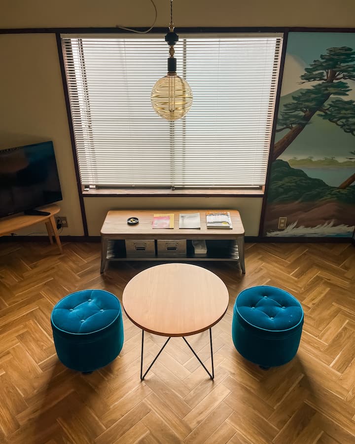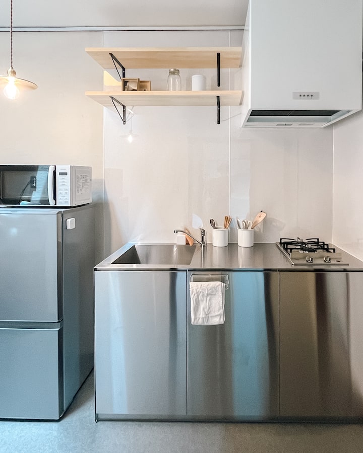 ห้องสไตล์โมเดิร์นย้อนยุค มีห้องอาบน้ำส่วนตูดีโอ สุขภัณฑ์ และห้องครัวส่วนตัว