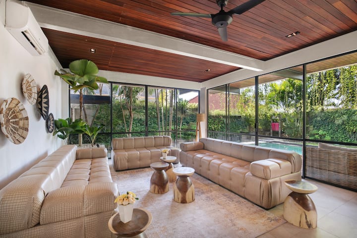 ห้องนั่งเล่นที่อยู่ชั้นล่างมีเครื่องปรับอากาศครบครันและมีพัดลมเพดานเพิ่มเติมเพื่อเพิ่มลมพัด ทำให้เป็นสถานที่พักผ่อนที่สมบูรณ์แบบจากความร้อนเขตร้อนของบาหลี