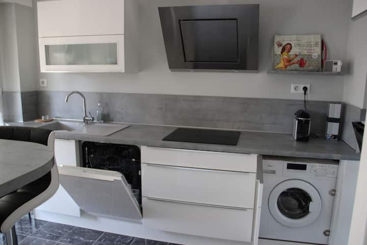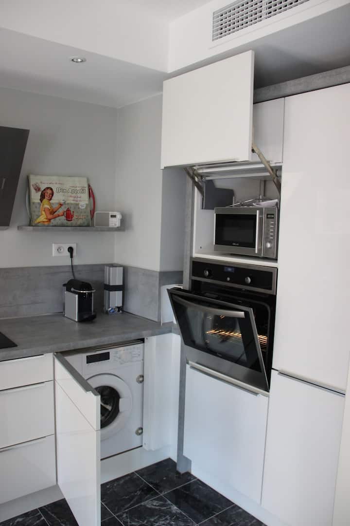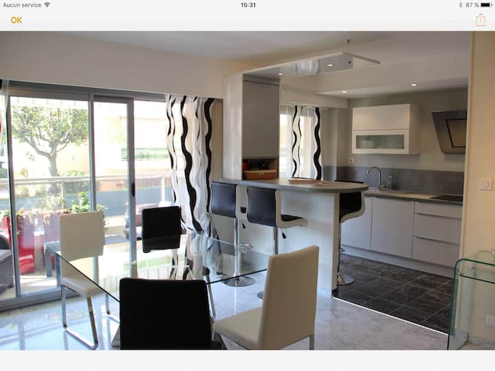 ฉันเช่าห้องสองห้องของฉันที่ตกแต่งโดยนักออกแบบภายในทั้งหมด สถานที่เงียบสงบที่จอดรถสะดวกใกล้ร้านค้าทั้งหมดและเดิน 7 นาทีถึง La Croisette และชายหาด