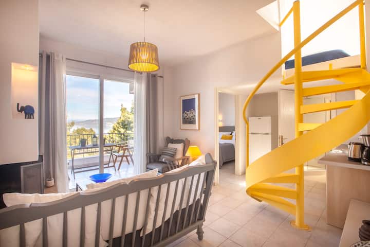 แฟลตสำหรับครอบครัว 1 ห้องนอนที่มีห้องใต้หลังคาพิเศษมีขนาดเพียง 50 ตร.ม. แต่มีที่พักที่ได้รับการออกแบบอย่างชาญฉลาดและสิ่งอำนวยความสะดวกที่มีห้องน้ำที่ปรับปรุงใหม่พร้อมฝักบัวมรสุมห้องครัวขนาดเล็กแต่มีอุปกรณ์ครบครันห้องนอนพร้อมตู้เสื้อผ้าห้องใต้หลังคาพร้อมเตียงเดี่ยว 2 เตียงห้องนั่งเล่นและระเบียงพร้อมพื้นที่รับประทานอาหารที่คุณจะได้เพลิดเพลินกับวิวพระอาทิตย์ตกดิน ทำเลที่ตั้งดีเยี่ยมบนเนินเขาในเขตชานเมืองของ N. Marmaras ห่างจากชายหาดและใจกลางหมู่บ้านเพียง 400 เมตรมีร้านค้าและร้านอาหารมากมาย