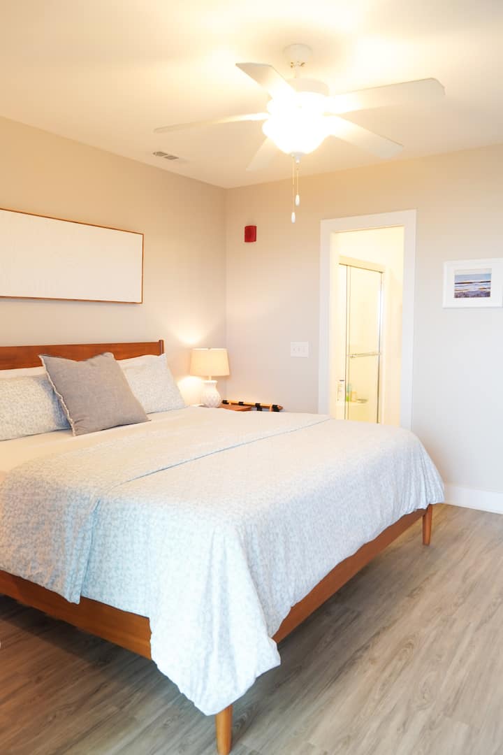 "The Beach Room" (Master Bedroom): บ้านของเตียงคิงไซส์ที่สะดวกสบายสุดๆพร้อมฟูกนอนใหม่เอี่ยมและผ้าไมโครไฟเบอร์ที่นุ่มและเย็นเป็นพิเศษ ห้องพักริมชายหาดมีอ่างอาบน้ำส่วนตัวเต็มรูปแบบตู้เสื้อผ้า 6 ลิ้นชักและตู้เสื้อผ้าแบบวอล์กอินส่วนตัวพร้อมชั้นวางกระเป๋าเดินทาง มีทีวีซัมซุงสมาร์ททีวีขนาด 42 "ติดผนังพร้อมกล่อง Roku สำหรับสตรีมมิ่ง เพลิดเพลินกับวิวทะเลจากทุกที่ในห้องนี้แม้จากเตียง!