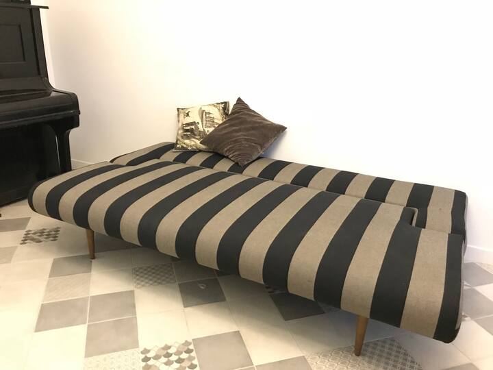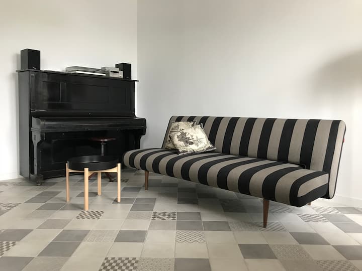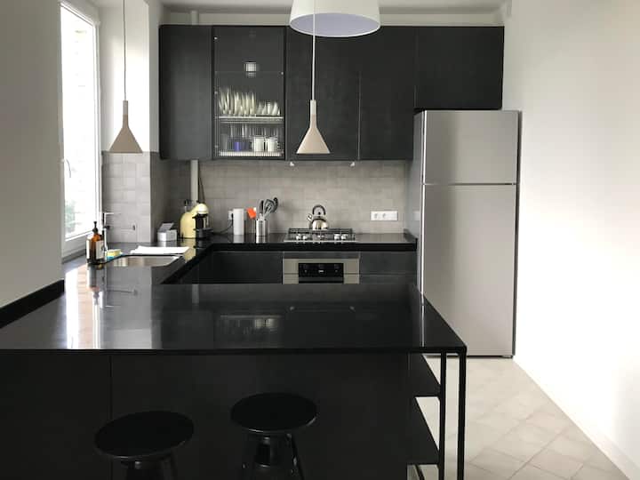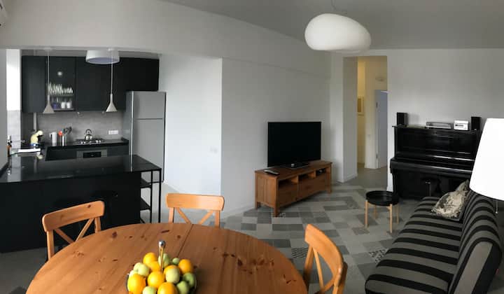 Two bedrooms (one with balcony), living room with tv, piano, vinyl and cd station, dining table. Fully equipped kitchen. Coffee machine. Washer/dryer and dishwasher. Spacious Bathroom with the rain shower. A/c in the main bedroom and living room. Sofa in the living room can be transformed into the full size bed.