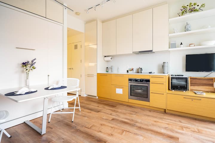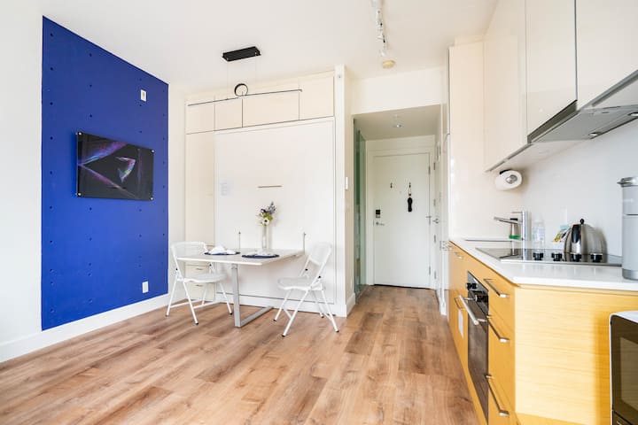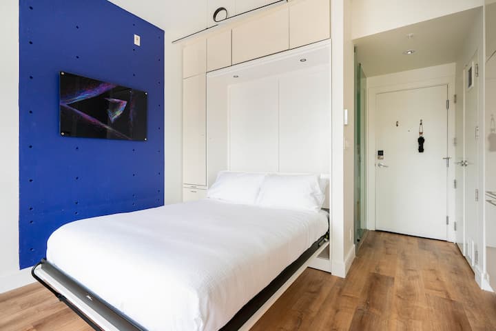 ห้องสวีทเป็นห้องไมโครลอฟท์ที่ทันสมัยไม่เหมือนใครพร้อมเพดานสูง 10 ฟุตตั้งอยู่ในอาคารเจเนียนอันเก่าแก่ อาคารนี้สร้างขึ้นครั้งแรกในปี 1891 และได้รับการปรับปรุงใหม่ทั้งหมดในปี 2016 ให้เป็นห้องสวีทที่ได้รับแรงบันดาลใจจากแนวคิดการใช้ชีวิตในพื้นที่ขนาดเล็กในยุโรปและเอเชียซึ่งเป็นที่พักที่ออกแบบมาอย่างมีประสิทธิภาพสูงและมีประสิทธิภาพสูงซึ่งเหมาะอย่างยิ่งสำหรับการใช้ชีวิตที่ทันสมัยที่สุด ไมโครลอฟท์สไตล์โมเดิร์นขนาด 300 ตารางฟุตมีภาพจิตรกรรมฝาผนังขนาดควีนไซส์ในตัวที่ดึงลงมาซ่อนโต๊ะรับประทานอาหารไว้ด้านล่าง เครื่องล้างจานและตู้เย็น/ตู้แช่แข็งซ่อนอยู่ในลิ้นชักที่กลมกลืนกับตู้อื่นๆในห้องครัวได้อย่างลงตัว