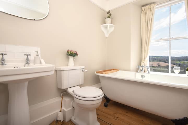 ห้องน้ำ 1: อ่างอาบน้ำแบบโรแมนติกขนาดใหญ่แบบโรแมนติกพร้อมเท้ากรงเล็บและวิวที่ยอดเยี่ยมทั่วหมู่บ้านพร้อมอ่างล้างหน้าและราวแขวนผ้าขนหนูอุ่น