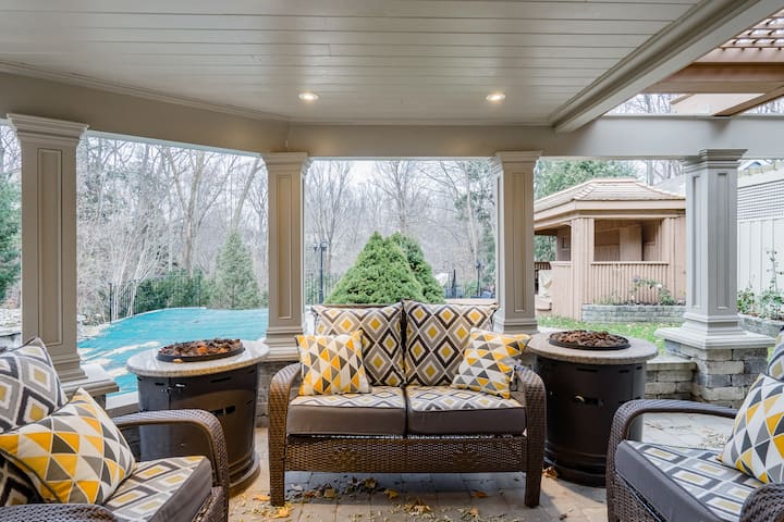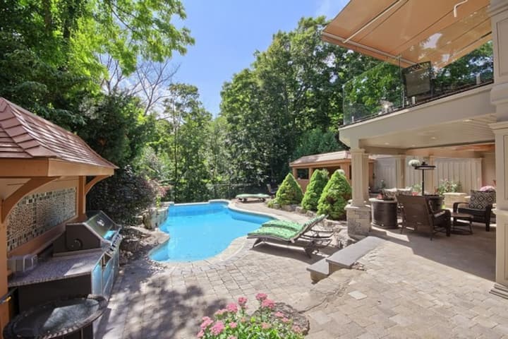 นอนลงข้างสระว่ายน้ำในวันฤดูร้อนหรือนั่งเล่นในบริเวณที่นั่งที่มีหลังคา สวนหลังบ้านล้อมรอบด้วยต้นไม้และทางเดินป่าเป็นทัศนียภาพที่สวยงามในช่วง 4 ฤดูกาลของแคนาดา